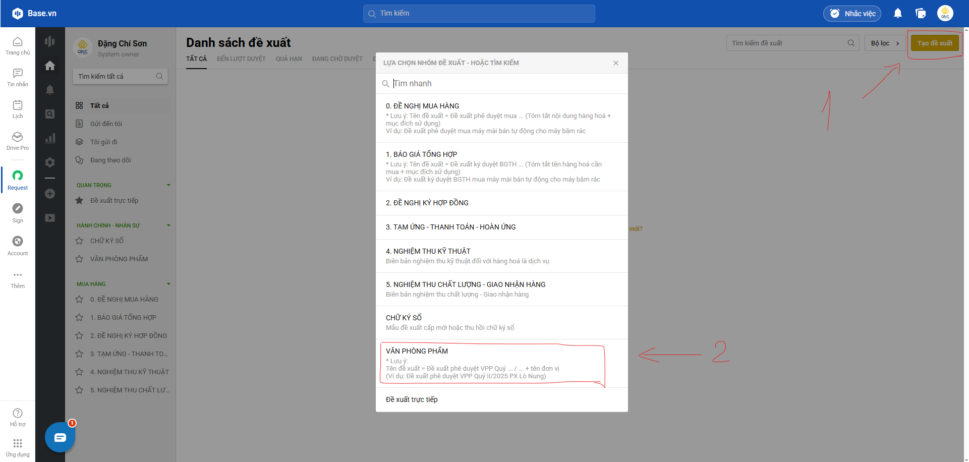 Bước 1: Chọn Tạo đề xuất -> Chọn Văn Phòng Phẩm