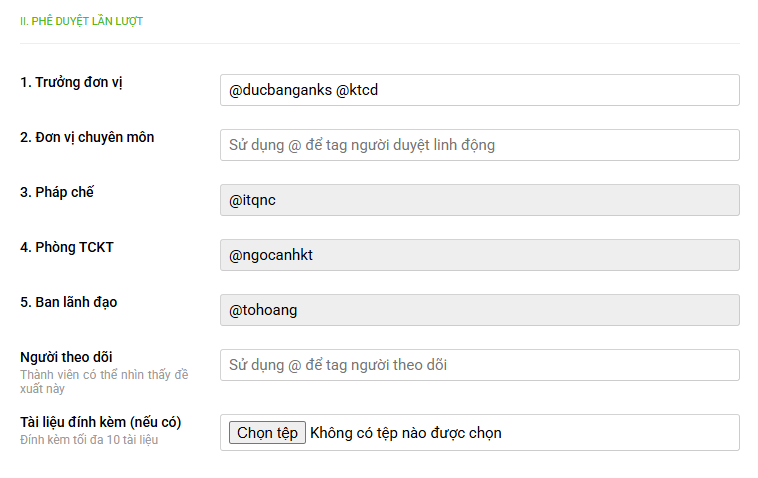 - Trưởng đơn vị: Căn cứ theo đơn vị đề xuất, người tạo đề xuất sẽ @username vào đây (Có thể thêm nhiều TP/QĐ)