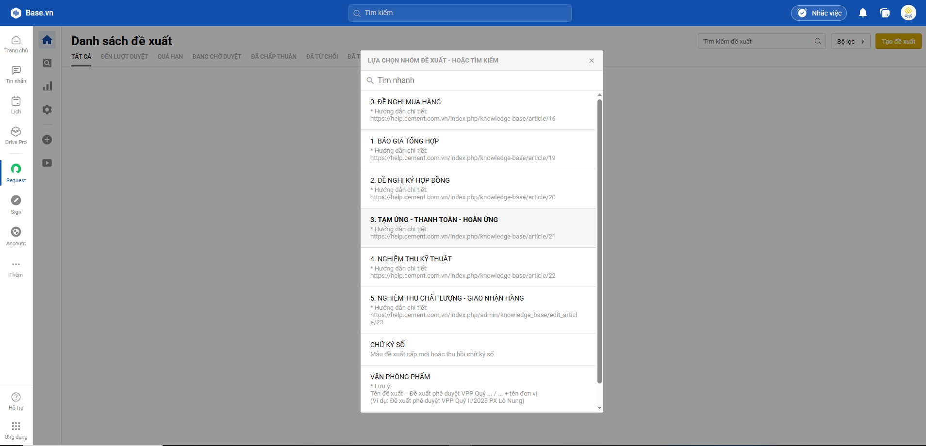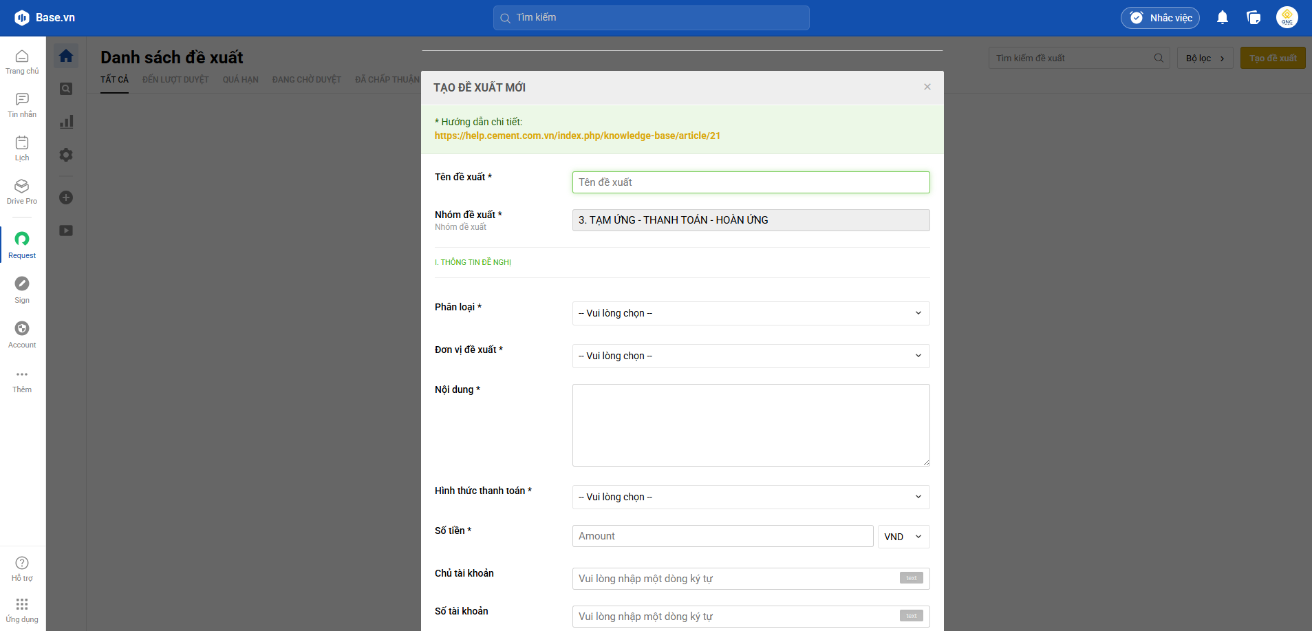 - Tên đề xuất: Đề xuất phê duyệt Tạm ứng/Hoàn ứng/Thanh toán + ...
