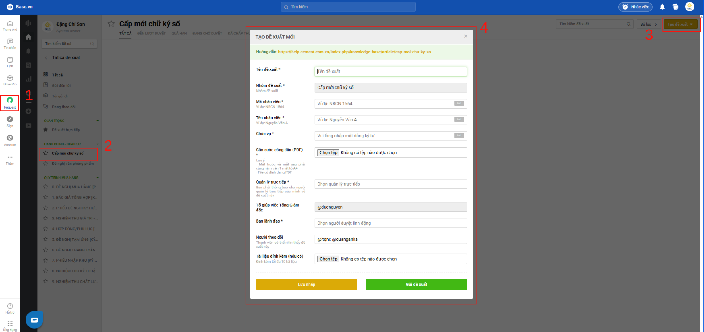 Bước 1: Thống kê/Người phụ trách đề xuất của đơn vị tạo phiếu đề xuất trên hệ thống BASE REQUEST